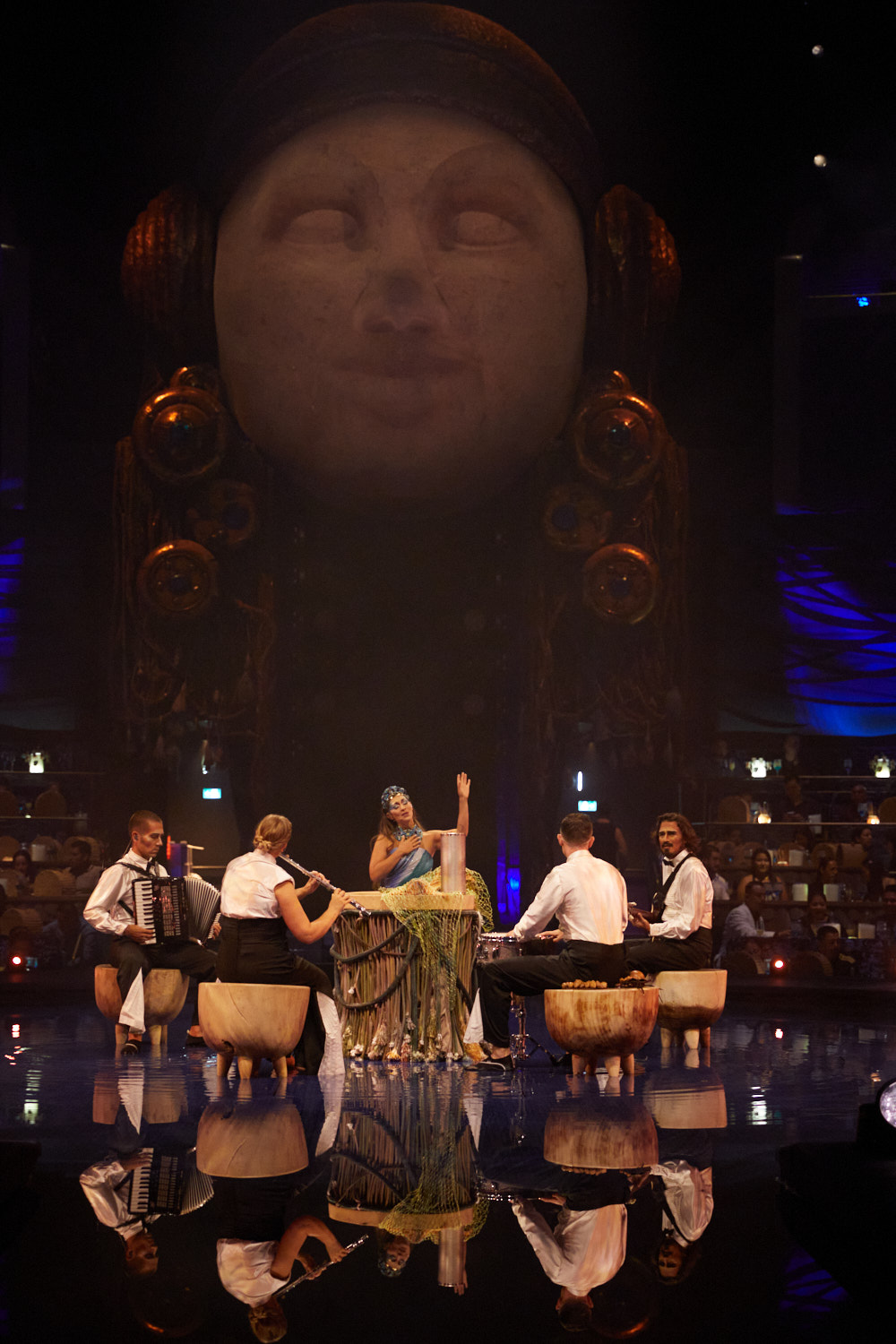 Las luces tiemblan como reflejos sobre el agua mientras músicos en vivo tejen melodías que evocan profundidades invisibles, y las copas de cristal se transforman en instrumentos para dar forma a una Orquesta de Cristal, interpretada colectivamente por el público, un ritual que despierta el sueño y da vida a la historia.