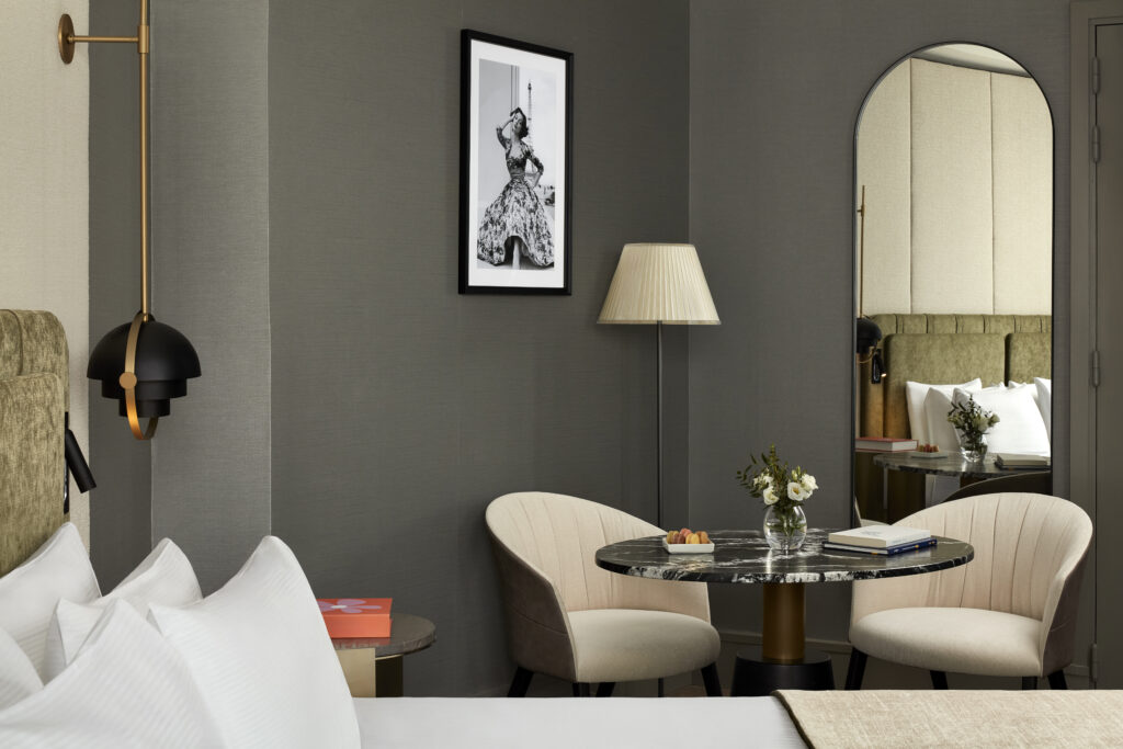 Las habitaciones y suites, decoradas con una elegancia atemporal, fusionan el encanto clásico de la arquitectura de la ciudad con las comodidades del diseño moderno. Además, como homenaje a las grandes casas de moda que han forjado la leyenda de París, están enriquecidas con una colección de fotografías en blanco y negro que celebran los íconos de estilo de los años 50 y 60, época dorada en la que París dictaba los códigos del glamour mundial.